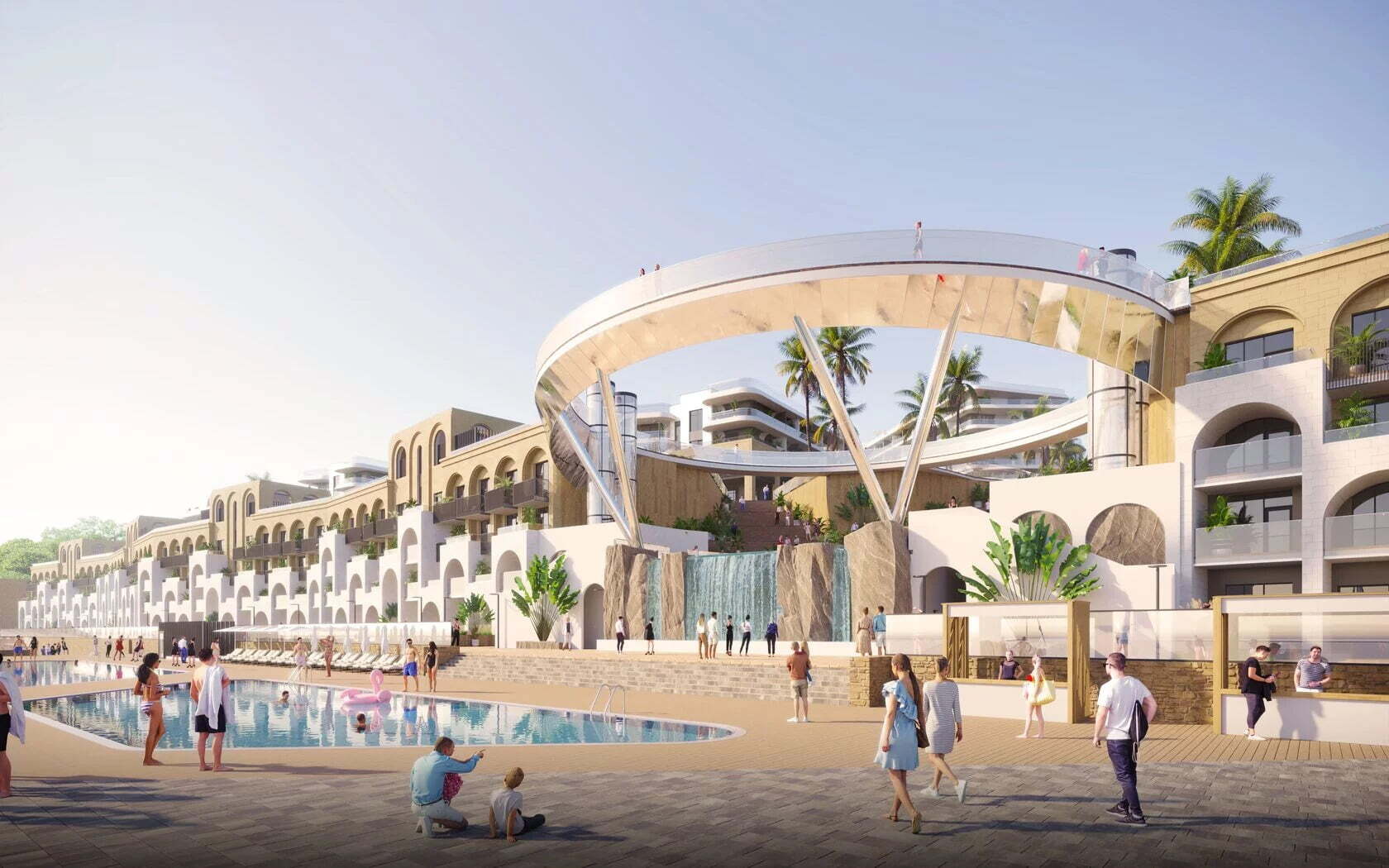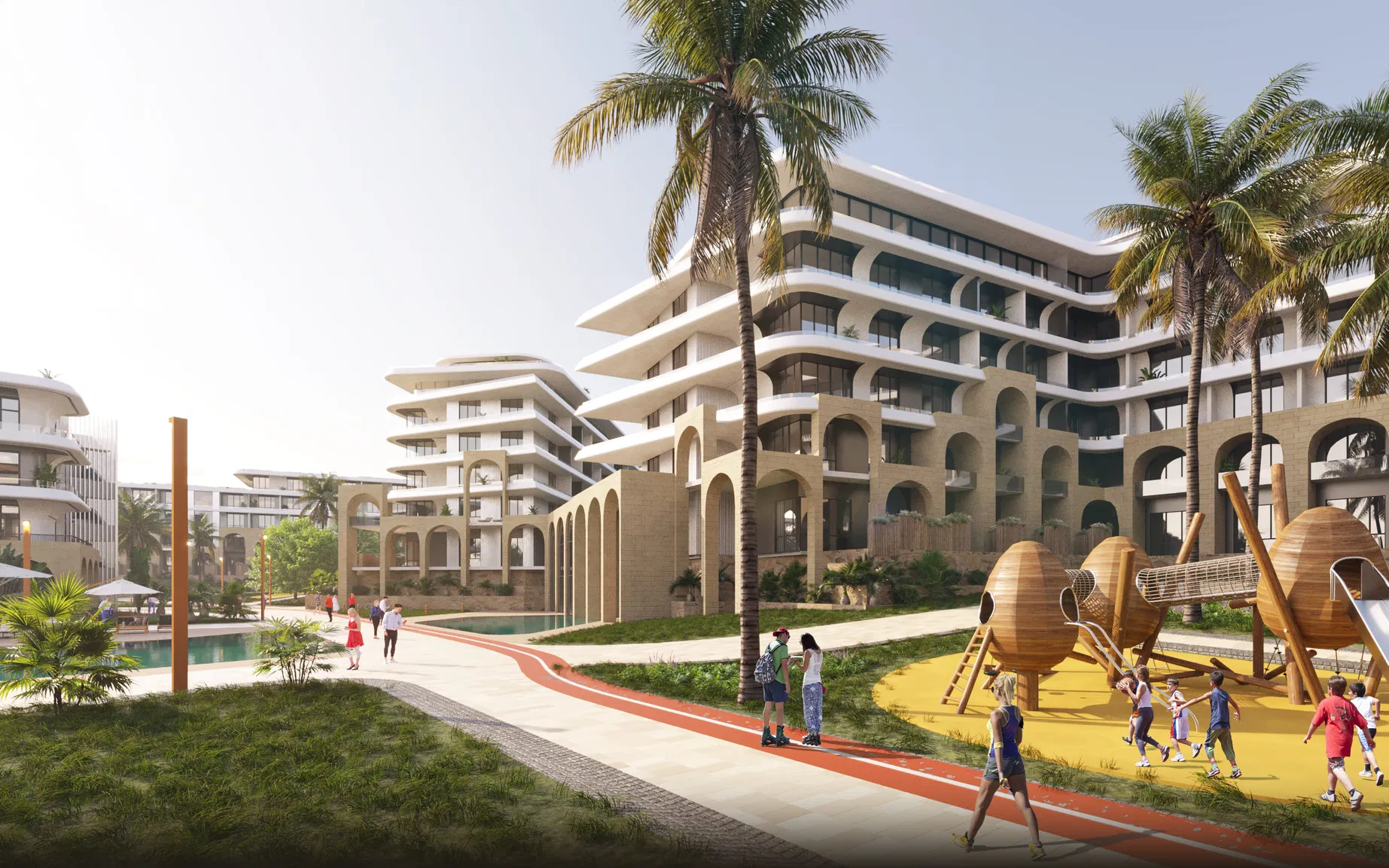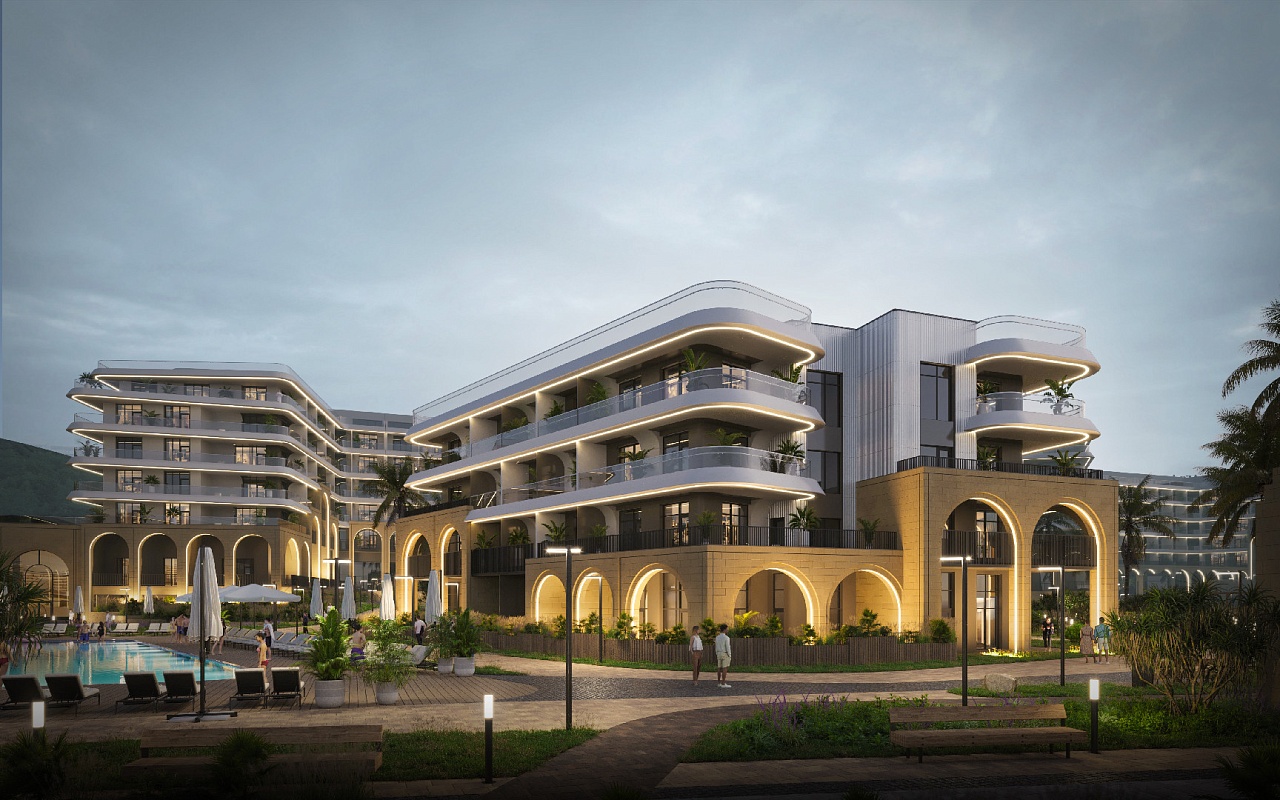 ● На территории комплекса — бассейны с подогревом, СПА-комплекс, детские и спортивные площадки, кафе и рестораны, медицинский центр, кинотеатр, коворкинг, большой амфитеатр и многое другое.