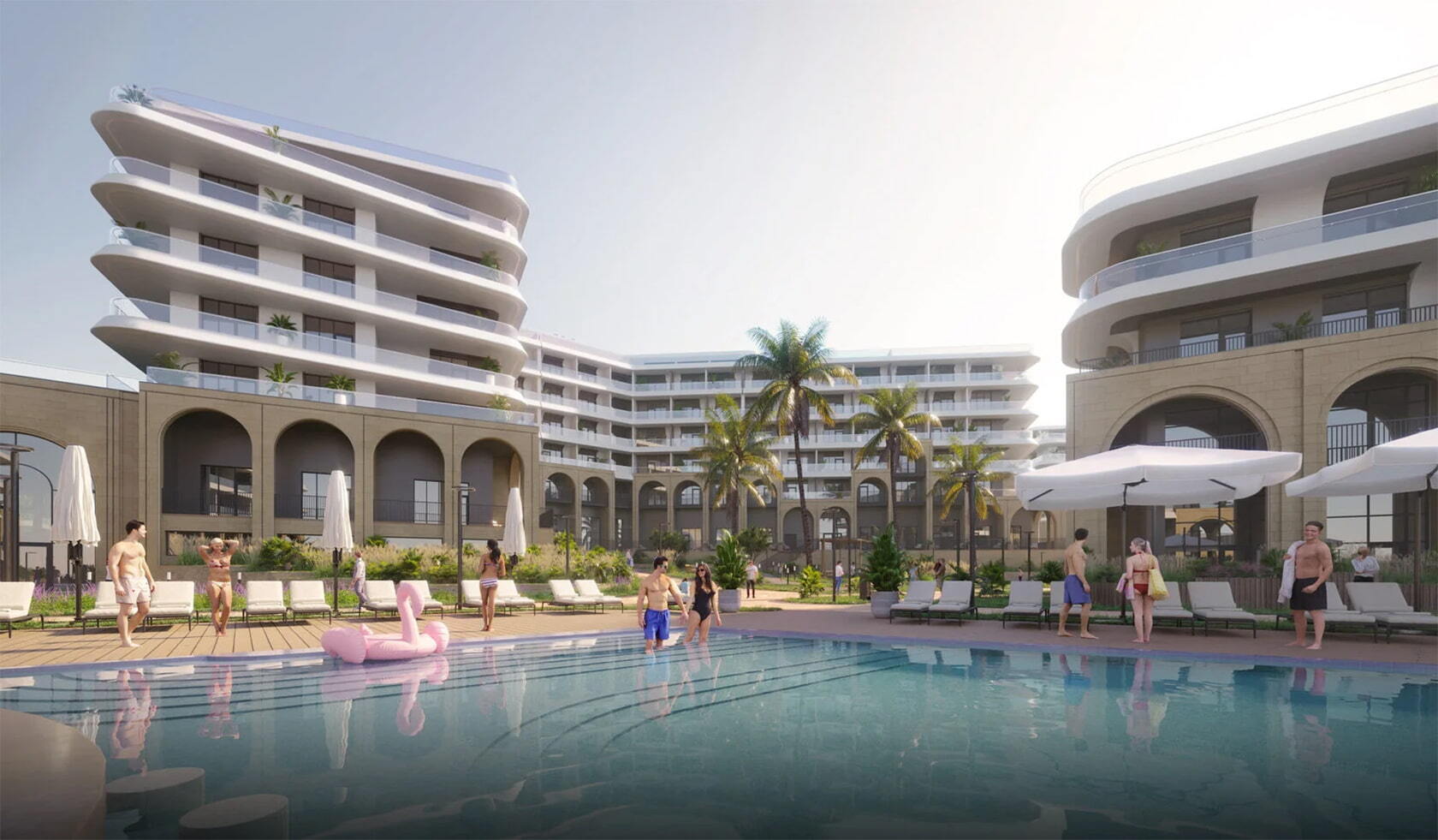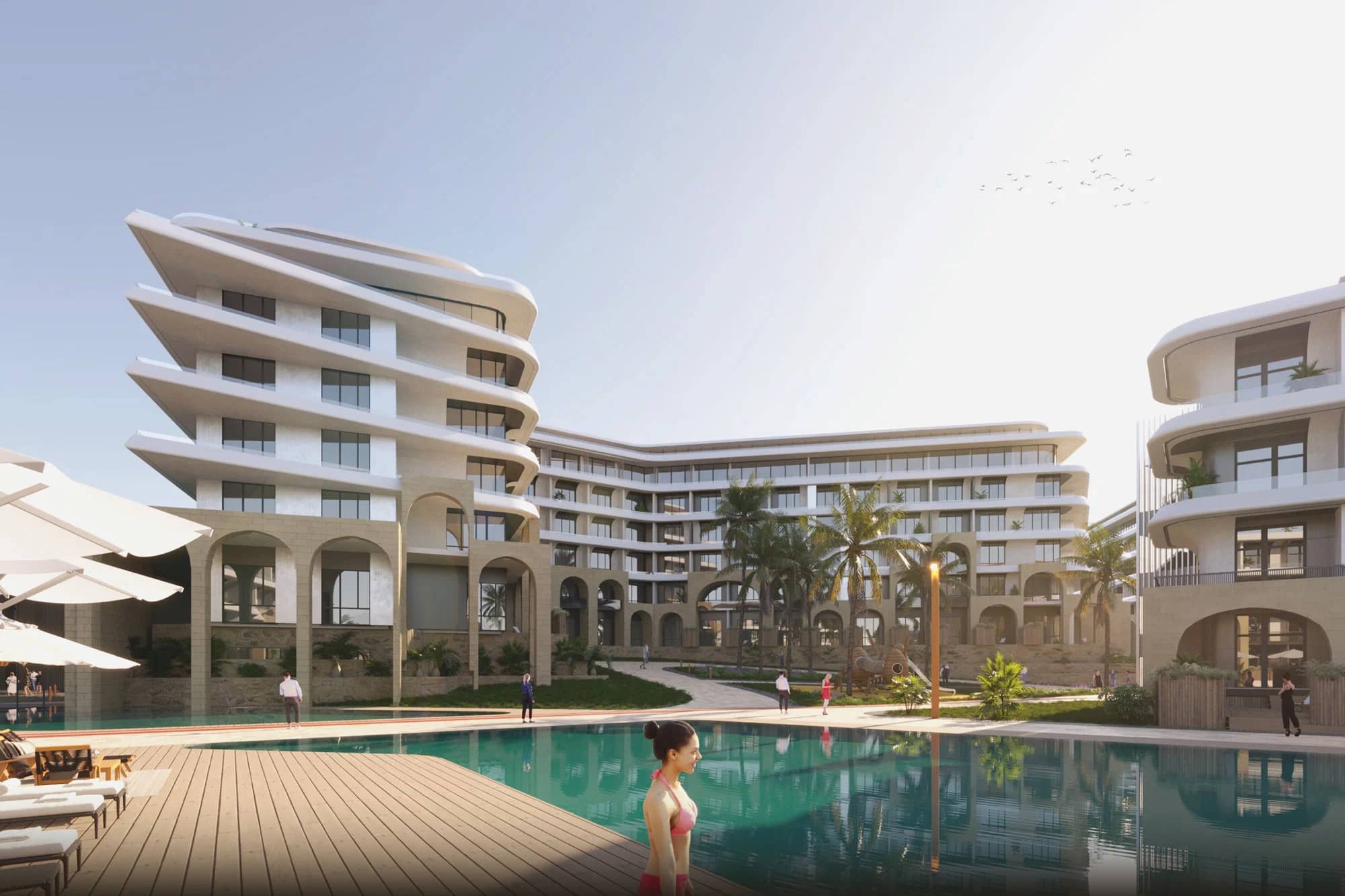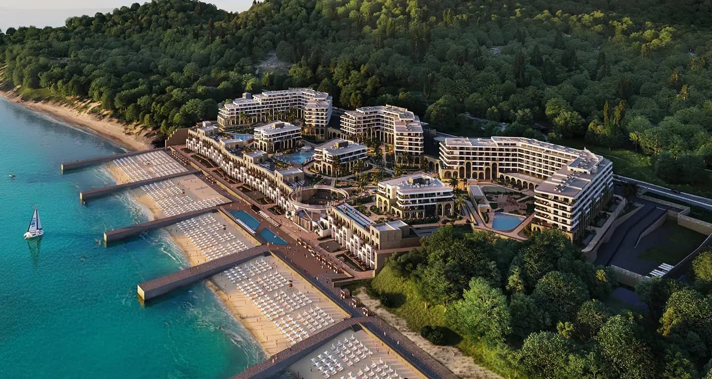 ● На территории комплекса — бассейны с подогревом, СПА-комплекс, детские и спортивные площадки, кафе и рестораны, медицинский центр, кинотеатр, коворкинг, большой амфитеатр и многое другое.